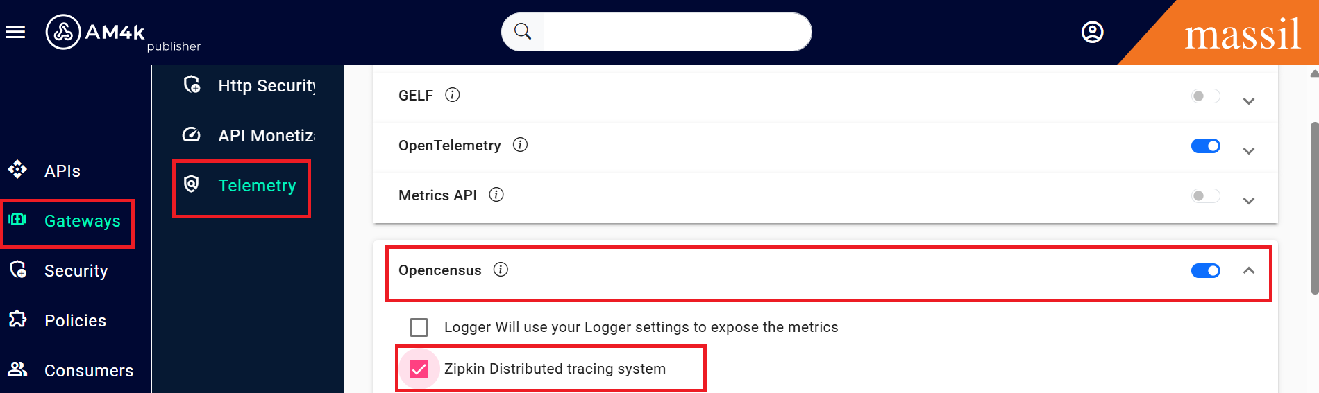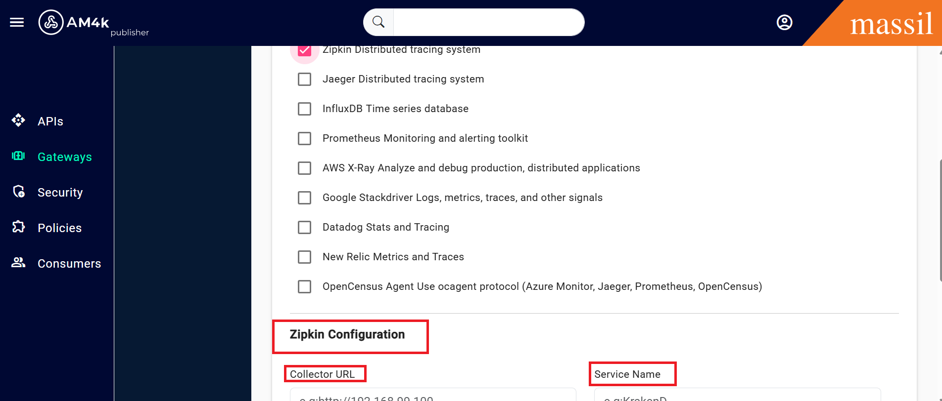 Zipkin Zipkin Telemetry Integration Step 1: Go to Gateways open telemetry then enable opencensues in opencensues click on checkbox Zipkin. Step 2: Once you clicked on check box as shown below you can see Zipkin Configuration fields. collector_url service_name