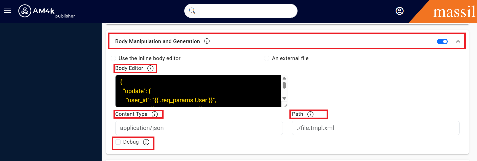 Request Manipulation With Templates Configuration for the body generator Step 1: Go to Backends select request below we can see Body Manipulation and Generation enable it in that section you can see all the provided fields Fields of Template-based body generator content_type debug path template